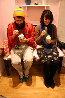 a sister/brother duo playing cute fuzzy music with a singing, a harp, ukulele, and toy drums.