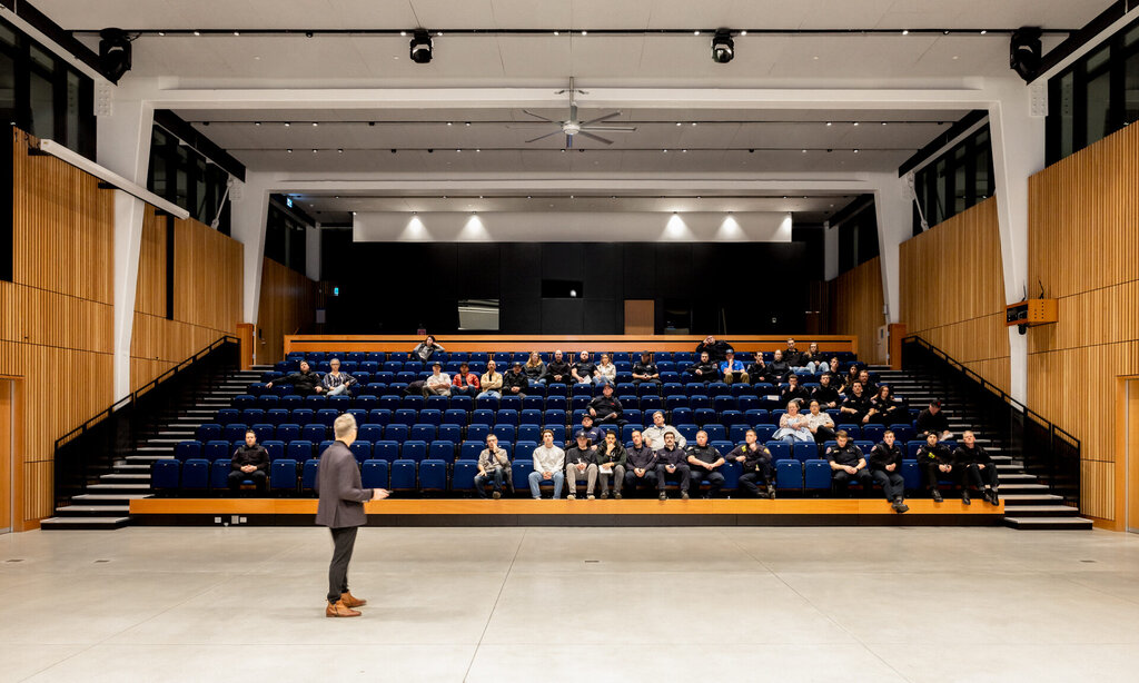 This new, multi-purpose auditorium was transformed from a swimming pool into a modern auditorium with space for 500 attendees.