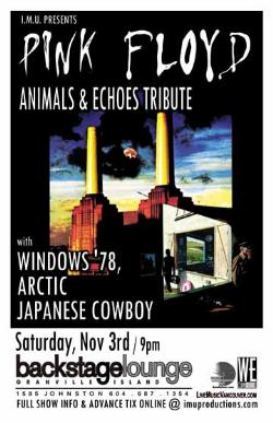 . Saturday, November 3rd I.M.U. presents PINK FLOYD ANIMALS & ECHOES TRIBUTE w/ WINDOWS '78, ARCTIC & JAPANESE COWBOY @ The Backstage Lounge on Granville Island (1585 Johnston St.) . 9pm