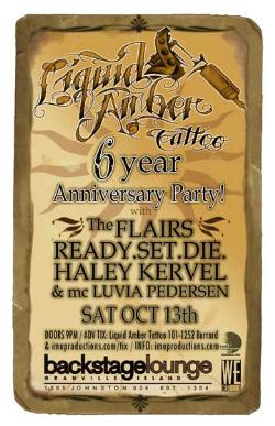 . Saturday, October 13th I.M.U. presents LIQUID AMBER 6th YEAR ANNIVERSARY PARTY! Featuring The FLAIRS, READY.SET.DIE, HAYLEY KERVEL & mc LUVIA PETERSEN @ The Backstage Lounge on Granville Island (1585 Johnston St.) . 9pm - Purchase advance tickets at Liquid Amber Tattoo, 101-1252 Burrard Street, Vancouver & online at http://www.imuproductions.com/tix