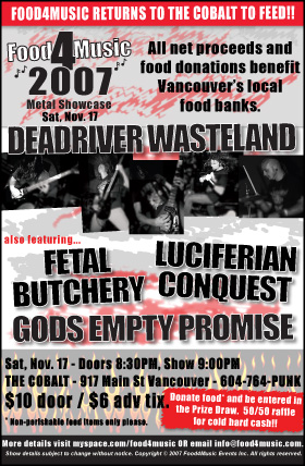 Food4Music 2007 Metal Showcase - Nov. 17: Dead River Wasteland, luciferian conquest, Fetal Butchery, GOD’S EMPTY PROMISE @ The Former Cobalt Nov 17 2007 - Jan 11th @ The Former Cobalt