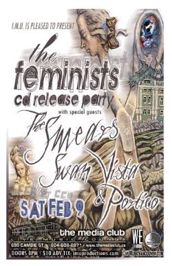 . Saturday, February 9th I.M.U. presents The FEMINISTS CD Release Party w/ The SMEARS, SWANVISTA & PORTICO @ The Media Club, 695 Cambie. Doors 8pm / $10 - Purchase advance tickets online @ http://www.imuproductions.com