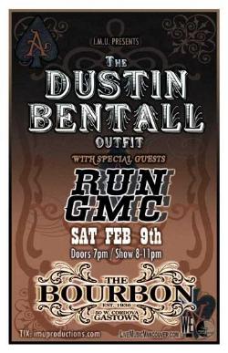 . Saturday, February 9th I.M.U. presents The DUSTIN BENTALL OUTFIT & RUN GMC @ The Bourbon, 50 West Cordova . Doors 7pm . Show 8-11pm sharp / $10 Advance - Purchase advance tickets online @ http://www.imuproductions.com