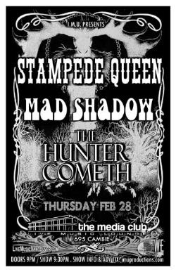 . Thursday, Feb 28th I.M.U. presents STAMPEDE QUEEN, MAD SHADOW & THE HUNTER COMETH @ The Media Club, 695 Cambie . Doors 9pm, $10 Advance - Purchase advance tickets via the bands & online @ http://www.imuproductions.com