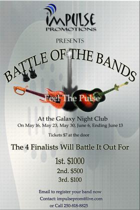 We are holding a Battle of the Bands starting Friday, May 16th for 5 consecutive fridays, four preliminaries(1 winner per week) for a four band final on Friday the 13th of June!!
