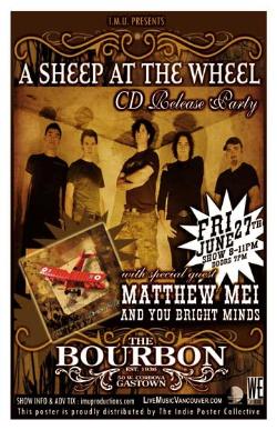 . TONIGHT! Friday, June 27th I.M.U. presents A SHEEP AT THE WHEEL CD Release Party w/ special guest MATTHEW MEI & YOU BRIGHT MINDS @ The Bourbon, 50 West Cordova . Early show 8-11pm sharp / Tix available directly via the bands or purchase advance tickets online @ www.imuproductions.com
