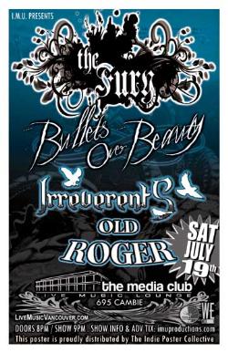 . Saturday, July 19th I.M.U. presents The FURY, BULLETS OVER BEAUTY, IRREVERENTS & OLD ROGER @ The Media Club, 695 Cambie . Doors 8pm / Tix available directly via the bands or purchase advance tickets online @ www.imuproductions.com