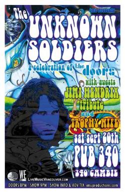 . Saturday, Sept 20th I.M.U. presents The UNKNOWN SOLDIERS A Celebration of The Doors, BLACK DOG Led Zeppelin Tribute, JIMI HENDRIX Tribute (Tony Robertson & The Vaqueros) & TROPHY WIFE @ PUB 340, Cambie Street / Buy advance tickets at Zulu, Scratch, Noize To Go, Neptoon & online @ www.imuproductions.com