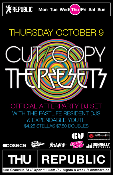 Official Cut Copy/The Presets afterparty at "Fastlife": Cut Copy, The Presets, Expendable Youth, Fastlife DJs @ Republic Dec 31 1969 - Jan 10th @ Republic