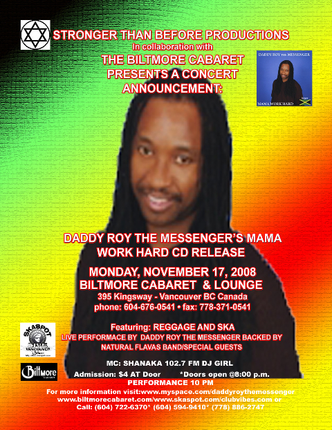 Mon Nov 17th - Daddy Roy the Messenger debuts his latest CD "Mama Work Hard" live on stage at the Biltmore at 10 pm. Backed up by popular local reggae band "Natural Flavas w/ guests".