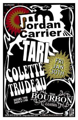 . Friday, Jan 30th IMU presents JORDAN CARRIER, TARL & COLETTE TRUDEAU @ The Bourbon, 50 West Cordova . Early show 8-11pm sharp / Purchase advance tickets online @ imuproductions.com