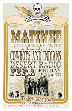 . Friday, June 26th IMU presents The MATINEE Tour Kick-Off Party with special guests COWBOYS AND INDIANS, DESERT RADIO & FERA @ The Railway Club, 579 Dunsmuir . Doors 9pm / Cover $10