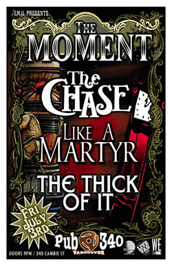. Friday, July 3rd IMU presents The MOMENT, The CHASE, LIKE A MARTYR & The THICK OF IT @ PUB 340, 340 Cambie Street . Doors 9pm / Purchase advance tickets directly via the bands & online @ www.imuproductions.com