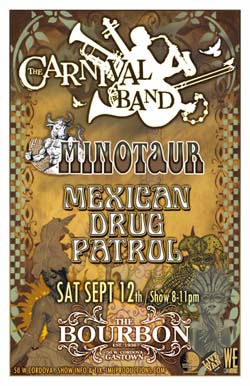. Saturday, September 12th IMU presents The CARNIVAL BAND w/ special guests MINOTAUR & MEXICAN DRUG PATROL @ The Bourbon, 50 West Cordova . Early show 8-11pm sharp / Purchase advance tickets online @ www.imuproductions.com