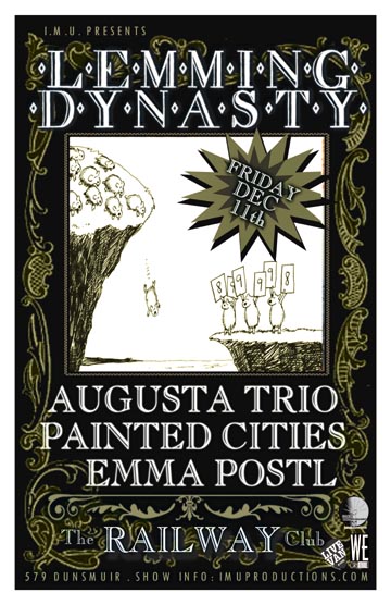 . Friday, December 11th IMU presents LEMMING DYNASTY, AUGUSTA TRIO, PAINTED CITIES & EMMA POSTL @ The Railway Club, 579 Dunsmuir . Doors 9pm / Cover $10 @ the door