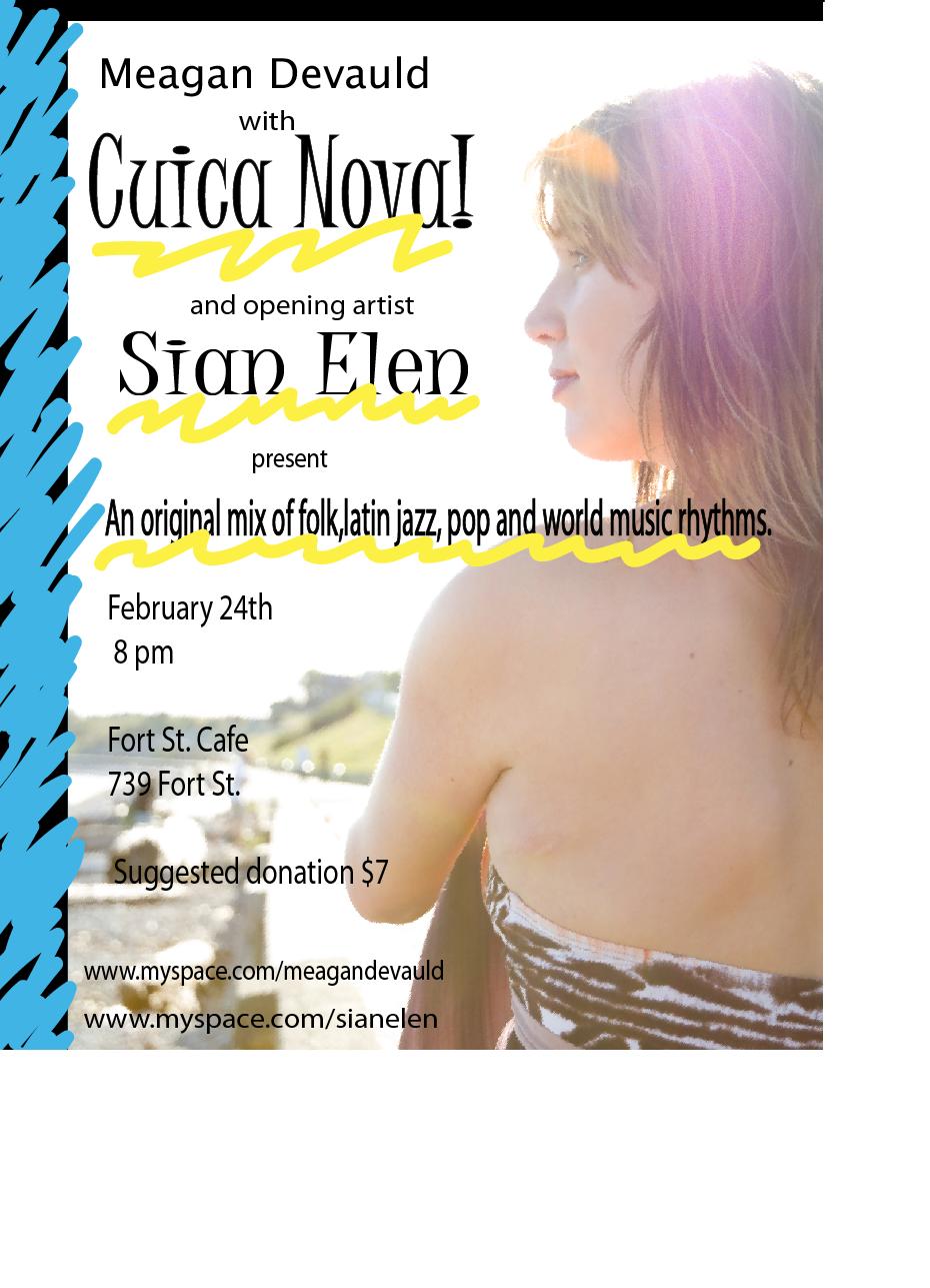 An original mix of latin/world grooves and folky jazz: Cuica Nova, Sian Elen @ The Fort Cafe Feb 24 2010 - Jan 30th @ The Fort Cafe
