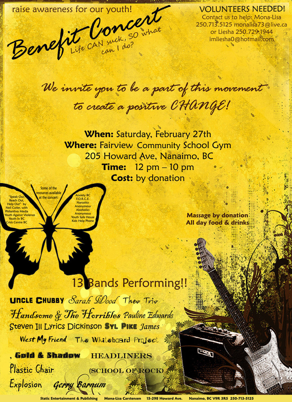Static Entertainment & Publishing is putting on a benefit concert to bring immediate awareness to the severity of depression in teens and their silent cries for help; to let them know they are not alone, and to provide them with the resources that are accessible to them. It takes a community to raise a child, therefore, starting right here in Nanaimo, we are committed to helping them take action through freedom of speech (THEIR perspectives on depression and seeking help), and offering them hope through inspirational stories from their peers. We are promoting resources that provide them with tools necessary for coping with life, and creating the change necessary to see life through new eyes. Help us help them to fight for their rights!