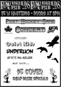 After Canada kicks the crap out of the USA in Mens Hockey, come down with your buzz on for some cheap drinks, good music, and high energy canadian celebrations with Quiet Kids, Underlion, AK747's Rob Nuclear and The Furniture.