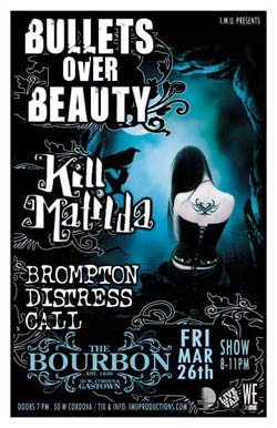 . Friday, March 26th IMU presents BULLETS OVER BEAUTY, KILL MATILDA & BROMPTON DISTRESS CALL . Early show 8-11pm sharp @ The Bourbon, 50 West Cordova / Purchase advance tickets directly via the bands & online @ http://www.imuproductions.com
