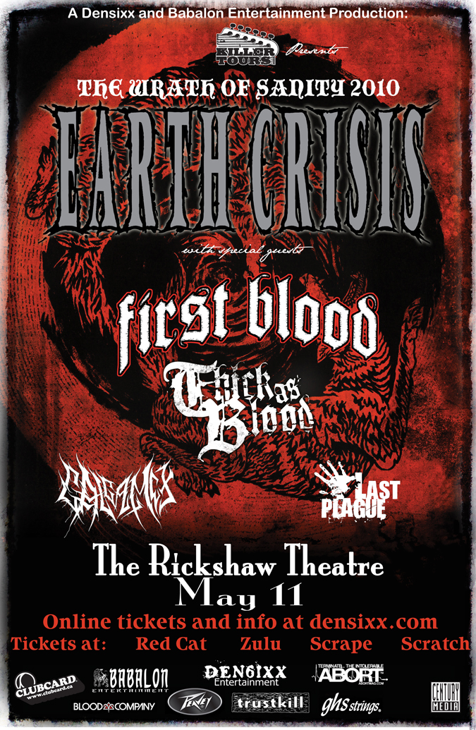 Attention all hardcore fans! The Wrath of Sanity Tour will be hitting the Rickshaw stage on May 11th, featuring vegan straight-edge artist Earth Crisis with guests First Blood and Thick As Blood, and early performances by locals Galgamex and Last Plague. This is going to be one kick ass event, get your tickets before it sells out!!