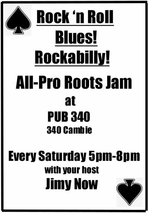 ALL PRO ROOTS MUSIC JAM ROCKABILLY 1950's 60's BLUES R&R SURF: All pro Roots music jam with, Jimy Now @ Pub 340 Aug 28 2010 - Feb 24th @ Pub 340