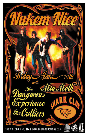 . Friday, January 14th IMU presents NUKEM NICE, MIA MOTH, The DANGEROUS EXPERIENCE & The OUTLIERS @ The Shark Club, 180 West Georgia Street . Doors 8pm . Purchase advance tickets directly via the bands & online @ http://www.imuproductions.com/tix