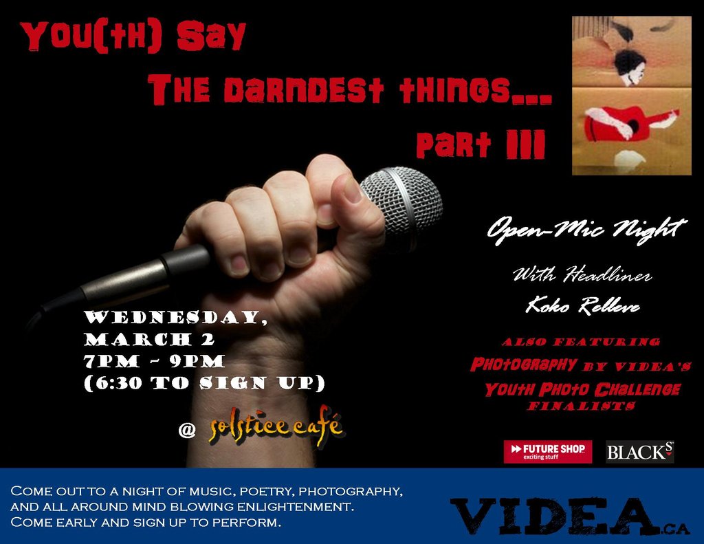We will also be displaying photography by the VIDEA Youth Photography Challenge Finalists and will present the top prize of a $200 Photography package donated by Futureshop
