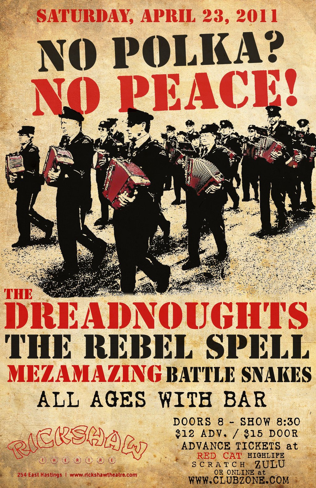 Dreadnoughts & The Rebel Spell: The Dreadnoughts, The Rebel Spell, Mezamazing, Battle Snakes, CHRIS WALTER @ Rickshaw Theatre Apr 23 2011 - Jan 1st @ Rickshaw Theatre