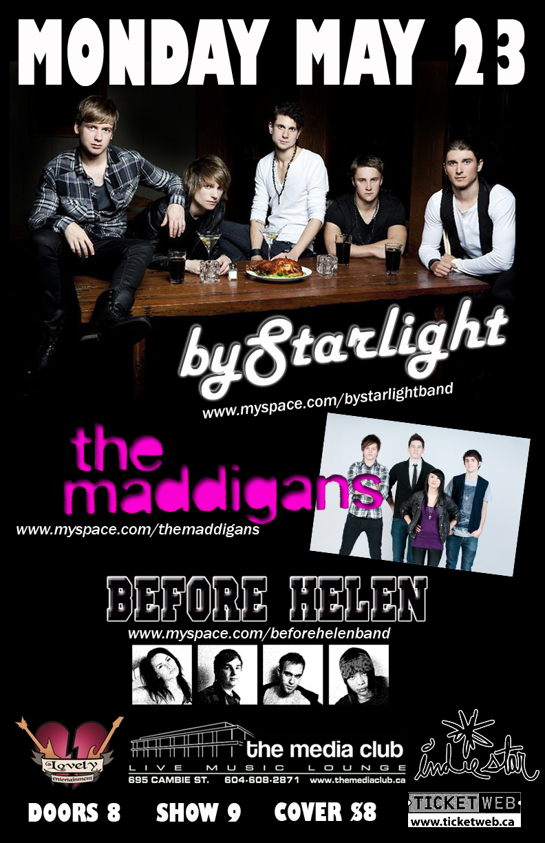 Bring your dancing shoes to this show! Punk goes POP at the Media club on May 23! Before Helen kicks off the night with high energy riffage and danceable beats. Next we have from Edmonton, The Maddigans making a comeback to Vancouver after a short haitus. To top it all off we have ByStarlight, Vancouvers next big sensation to follow in the footsteps of the likes of Marianas Trench. Show off your best dance moves when these guys hit the stage!