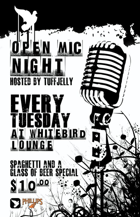 Every Tuesday Open Mic @ Whitebird Lounge. Spaghetti and beer special 10$, 2 mics, 2 extra inputs on PA (for extra guitar/mic), guitar amp, and drums available.