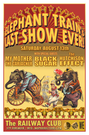 . Saturday, August 13th IMU presents ELEPHANT TRAIN'S LAST SHOW EVER! w/ special guests MY MOTHER THE CARJACKER, BLACK SUGAR & The HUTCHISON EFFECT @ The Railway Club, 579 Dunsmuir . Doors 9pm / Cover $10 . Purchase advance tickets online @ http://www.imuproductions.com/tix