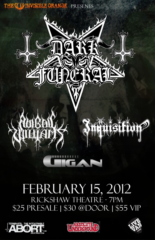 The Invisible Orange http://www.theinvisibleorange.com presents Swedish black metal marauders DARK FUNERAL http://www.darkfuneral.se February 15 at the Rickshaw Theatre.