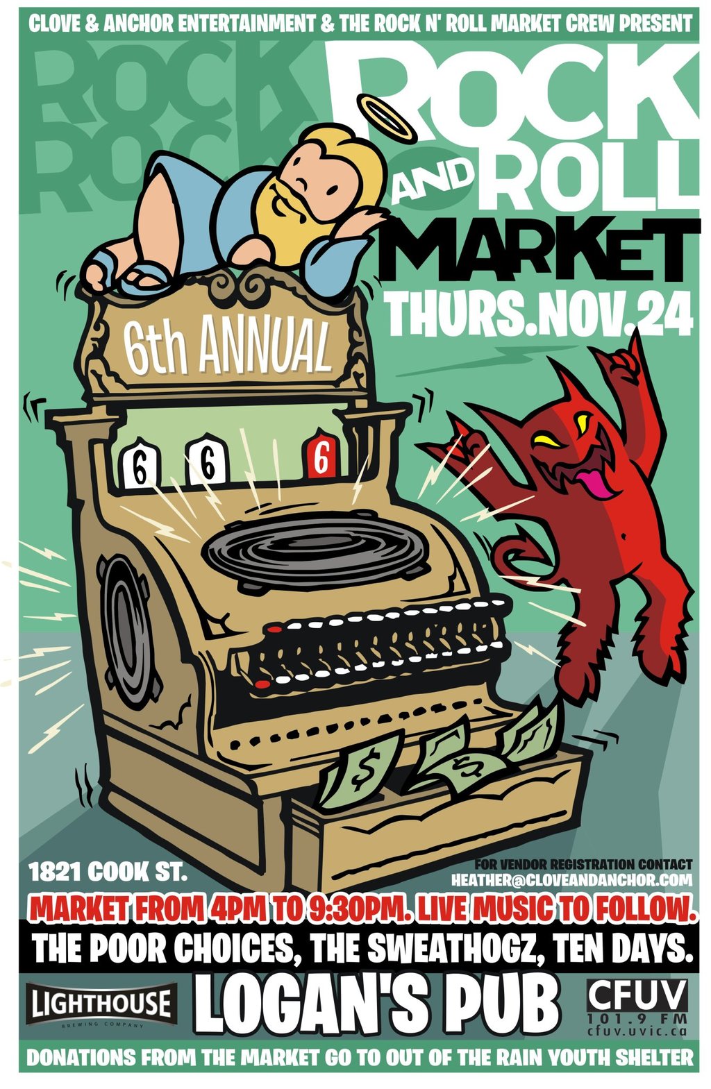 We are pleased to announce the 6th Annual Rock, Rock, Rock, n’ Roll Market has returned for another great year! This year’s event will be held Nov.24th at Logan’s Pub, 1821 Cook Street. Our participating vendors are a wide array of artists that have the opportunity to showcase their work from clothing, comics, art pieces, jewelry, leather ware, etc. The market consists of as always some of the fun and favorite local artisans from around British Columbia with music to follow. The market starts at 4pm and ends at 9:30pm. Donations are accepted at the door during the market for the Out of the Rain Youth Shelter. The early bird registration ends Friday November 18th. Please register at Regalia Boutique, 16 Fan Tan Ally. For further information please contact Heather Furneaux at [email protected] .