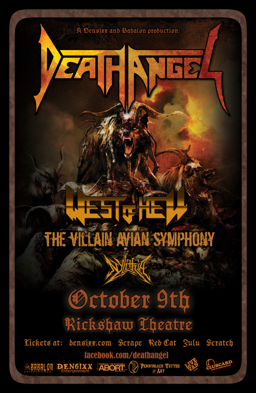 Death Angel returns to the Rickshaw: Death Angel, West of Hell, The Villain Avian Symphony, Nylithia @ Rickshaw Theatre Oct 9 2011 - Feb 22nd @ Rickshaw Theatre