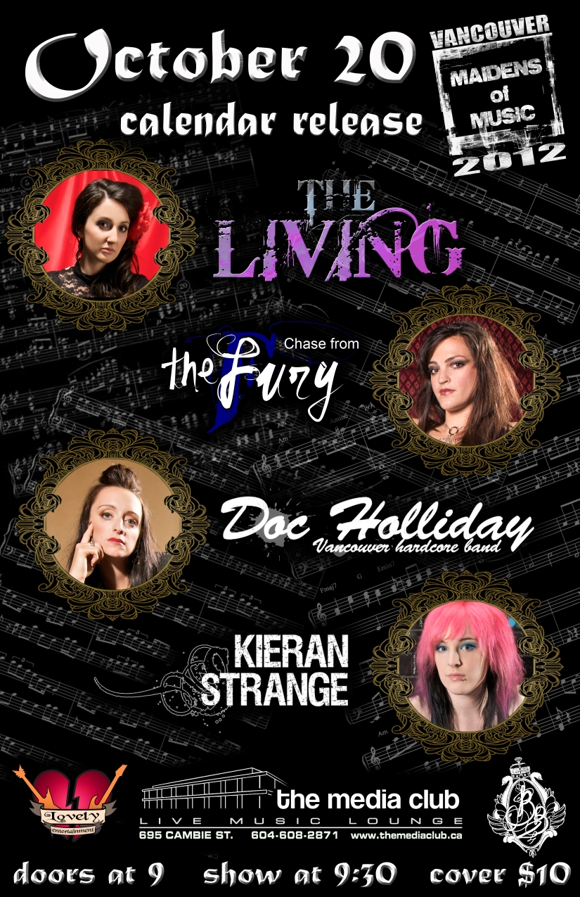 Find her on Twitter, Miss KIERAN STRANGE is kicking off our rockin night with her pop punk stylings. Shit gets heavier when APRIL REED takes the stage with hardcore band DOC HOLLIDAY! Thirdly Miss CHASE PATTENSON from THE FURY shows off some new songs and a new lineup! After 2 years and travelling to Germany THE LIVING is back in Vancouver with ELYSE BELLADONNA playing violin in an exciting new set.
