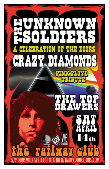 . Saturday, April 14th IMU presents The UNKNOWN SOLDIERS A Celebration Of The Doors, CRAZY DIAMONDS Pink Floyd Tribute & The TOP DRAWERS @ The Railway Club, 579 Dunsmuir . Doors 9pm / Purchase advance tickets online @ http://www.imuproductions.com/tix