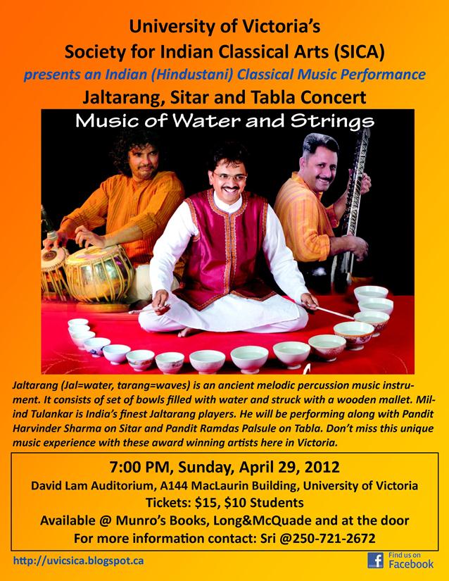 Society For Indian Classical Arts(SICA), a student club at UVic presents "An Evening of Indian Classical Music on Jaltarang, Sitar and Tabla" by Milind Tulankar (Jaltarang), Dr. Harvinder Sharma (Sitar) and Pandit Ramdas Palsule (Tabla).