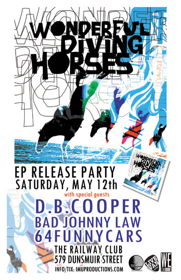 . Saturday, May 12th IMU presents WONDERFUL DIVING HORSES EP Release Party w/ D.B.COOPER, 64FUNNYCARS & BAD JOHNNY LAW @ The Railway Club, 579 Dunsmuir . Doors 9pm / Purchase advance tickets online @ http://www.imuproductions.com/tix