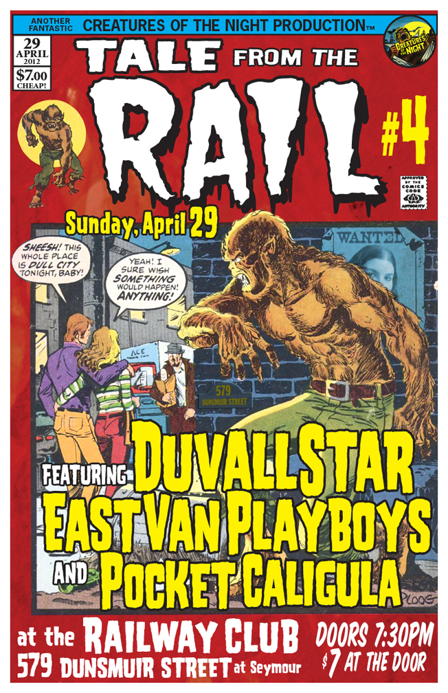 The Creatures of the Night team is proud to present TALE FROM THE RAIL #4!!! Come join us for yet another dose of guaranteed rock and roll excess, featuring Pocket Caligula, the East Van Playboys and Duvallstar!!!