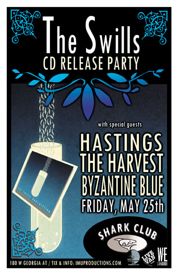 . Friday May 25th IMU presents The SWILLS CD Release Party w/ HASTINGS, The HARVEST & BYZANTINE BLUE @ The Shark Club, 180 West Georgia Street . Doors 8pm . Purchase advance tickets directly via the bands & online @ http://www.imuproductions.com/tix