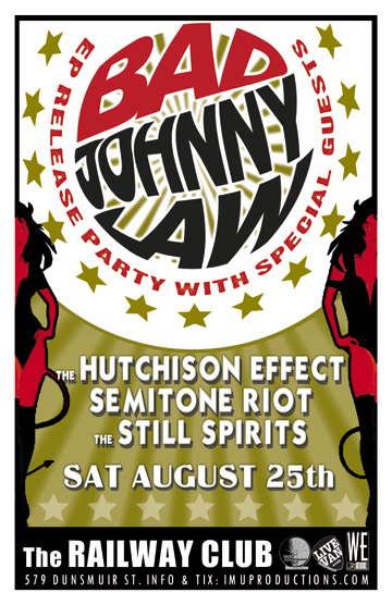 . Saturday, August 25th IMU presents - BAD JOHNNY LAW EP Release Party w/ SEMITONE RIOT, The HUTCHISON EFFECT & The STILL SPIRITS @ The Railway Club, 579 Dunsmuir . Doors 9pm / Purchase advance tickets online @ http://www.imuproductions.com/tix