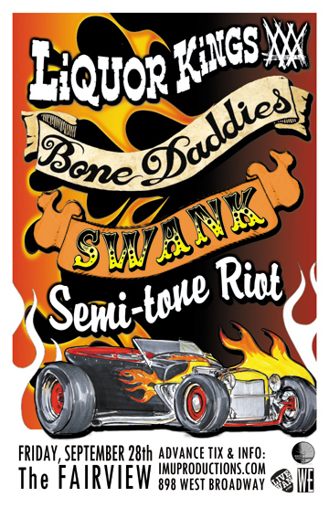 . Friday, September 28th IMU presents The LIQUOR KINGS, The BONE DADDIES, SWANK & SEMI-TONE RIOT @ The Fairview, 898 West Broadway . Doors 8pm / Purchase advance tickets directly via the bands and online @ http://www.imuproductions.com/tix