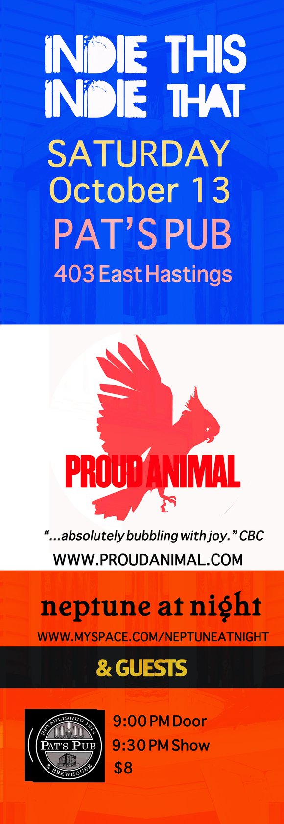 Indie This, Indie That: Proud Animal, NEPTUNE AT NIGHT, Guests @ Pat's Pub Oct 13 2012 - Feb 22nd @ Pat's Pub