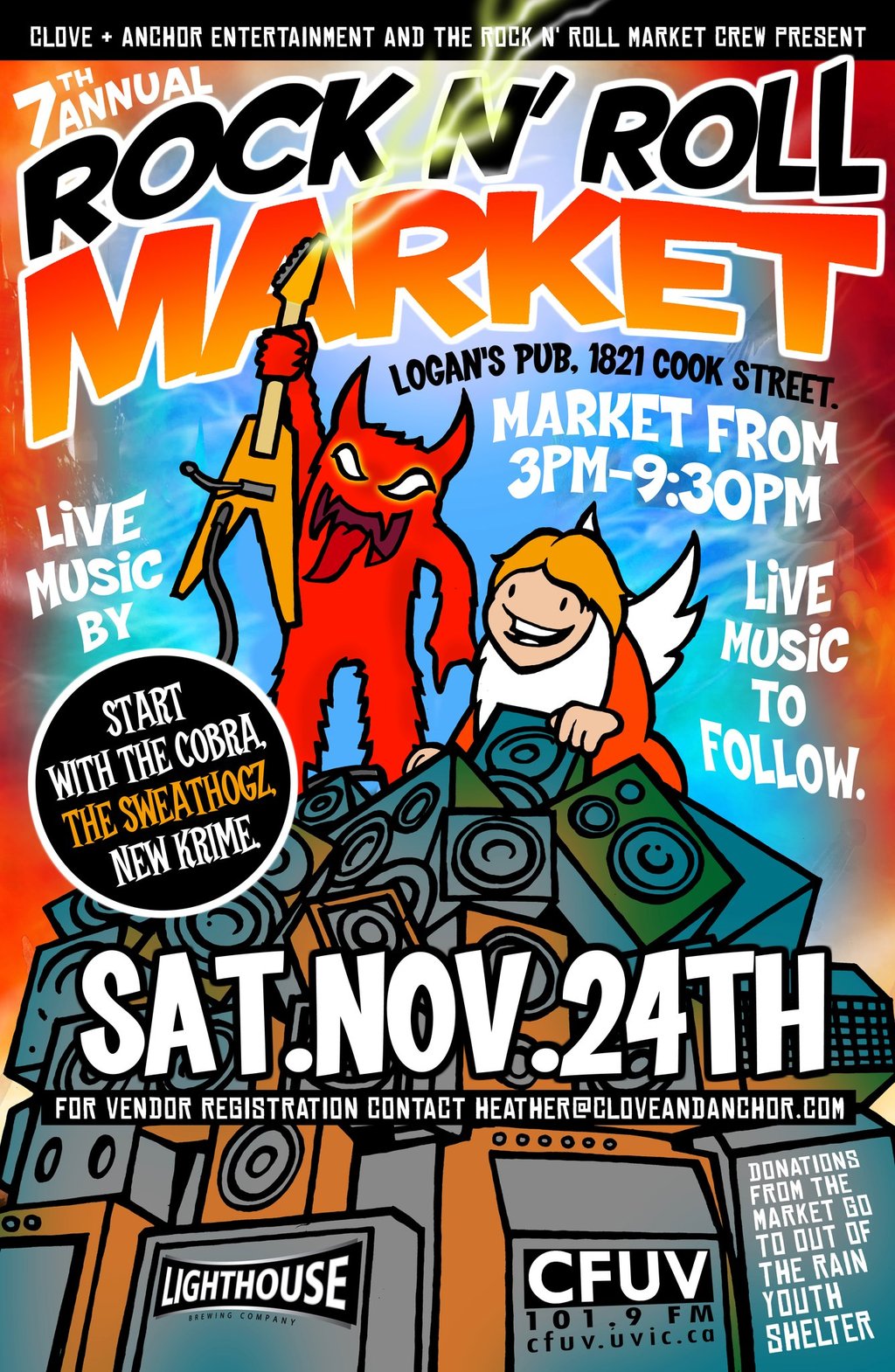 We are pleased to announce the 7th Annual Rock, Rock, Rock, n’ Roll Market has returned for another great year! This year’s event will be held Saturday Nov.24th at Logan’s Pub, 1821 Cook Street. Our participating vendors are a wide array of artists that have the opportunity to showcase their work from clothing, comics, art pieces, jewelry, leather ware, etc. The market consists of as always some of the fun and favorite local artisans from around British Columbia with music to follow. The market starts at 3p
