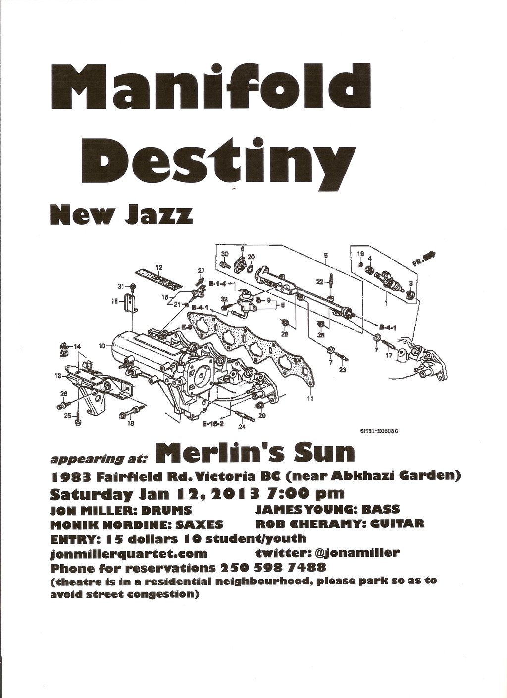 The Jon Miller Quartet is a jazz quartet from Victoria BC also bearing the group title “Manifold Destiny.” This alternate identity is meant to represent the group's current musical incarnation which has evolved in many ways since the group's 2009 release “Orchidology.” The band's predominantly original music in the mainstream-jazz vein is now by turns more playful, darker and diverse than in the past, incorporating influences from sources both within and outside the jazz vein including fusion and world music. The addition of Monik Nordine on alto and soprano saxophones brings a new, dynamic and highly accomplished writing and playing voice to mix. (Nordine replaces the excellent but over-committed Roy Styffe). Musical points of reference include guitarist John Scofield, the early fusion of Miles Davis, Brian Blade, Chris Dave, Gretchen Parlato, Jessica Williams, Gil Evans as well as many that blur the boundaries of the jazz realm. We are excited to be playing lots of new original music in our first live show in over a year on Jan 12th 2013 at Merlin’s Sun Theatre. Merlin's Sun is our favourite house-concert venue...if you've never been you will be pleasantly surprised. With Rob Cheramy -guitar, Monik Nordine -saxes, James Young -bass, Jon Miller -drums.