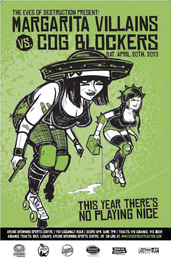 The Eves of Destruction Roller Derby league is proud to announce that our hometown badass banditas, The Margarita Villains, are squaring off against the Cog Blockers for the first home bout of the 2013 season on April 20. The Cogs are coming all the way from green-eggs-and-Belling-ham for this bout, which promises to be quite the battle. Our prediction: you will like it, Sam-I-Am!