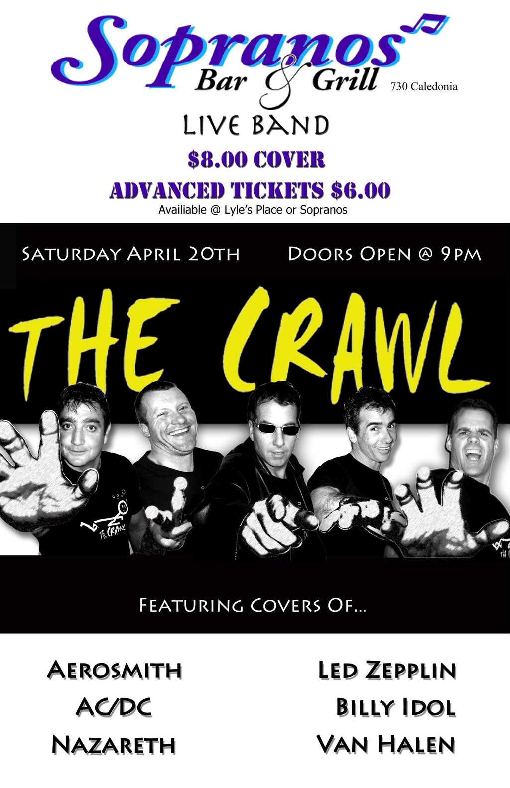 The Crawl return to Soprano's Saturday April 20th! Featuring covers of Aerosmith, AC/DC, Nazareth, Led Zepplin, Billy Idol, & Van Halen. Tickets $6 on sale at Lyle's Place & Soprano's. $8 at the door. Join us before the door and get in free. $8 beer, burger & fries from 4-6pm! Karaoke in between sets!