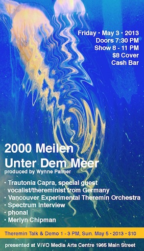 May 3, 2013 will be an evening of experimental electronic music produced by VETO member Wynne Palmer. Featuring pieces from her new album, German vocalist/thereminist Trautonia Capra will be joined by the Vancouver Experimental Theremin Orchestra, local electronic quartet Spectrum Interview, Vancouver electronic composer phonal and local sound/video feedback artist Merlyn Chipman in an evening of atmospheric vocals, rhythmic pulses, drone and noise compositions.