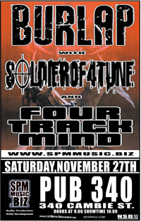 THE RETURN OF BURLAP: Burlap, SOLDIEROF4TUNE, Four Track Mind @ Pub 340 Nov 27 2004 - Feb 5th @ Pub 340