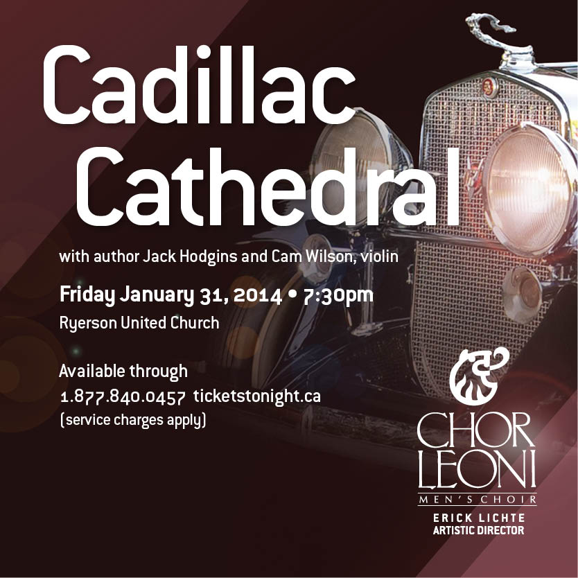 Here’s a recipe for a rollicking good show. Take renowned Canadian author Jack Hodgins, put him on stage reading a story he’s written especially for this occasion, back him up with the men of Chor Leoni, together with fiddler Cam Wilson and his band, mix well with some favourites from the choir’s repertoire, plus new tunes written by Cam and, voilà, Cadillac Cathedral, a deliciously funny and moving tale about an old hearse rescued from oblivion and an old man given new life along the backroads of Vancouver Island. Only one performance each in Vancouver, Victoria and Nanaimo. Don’t miss it!